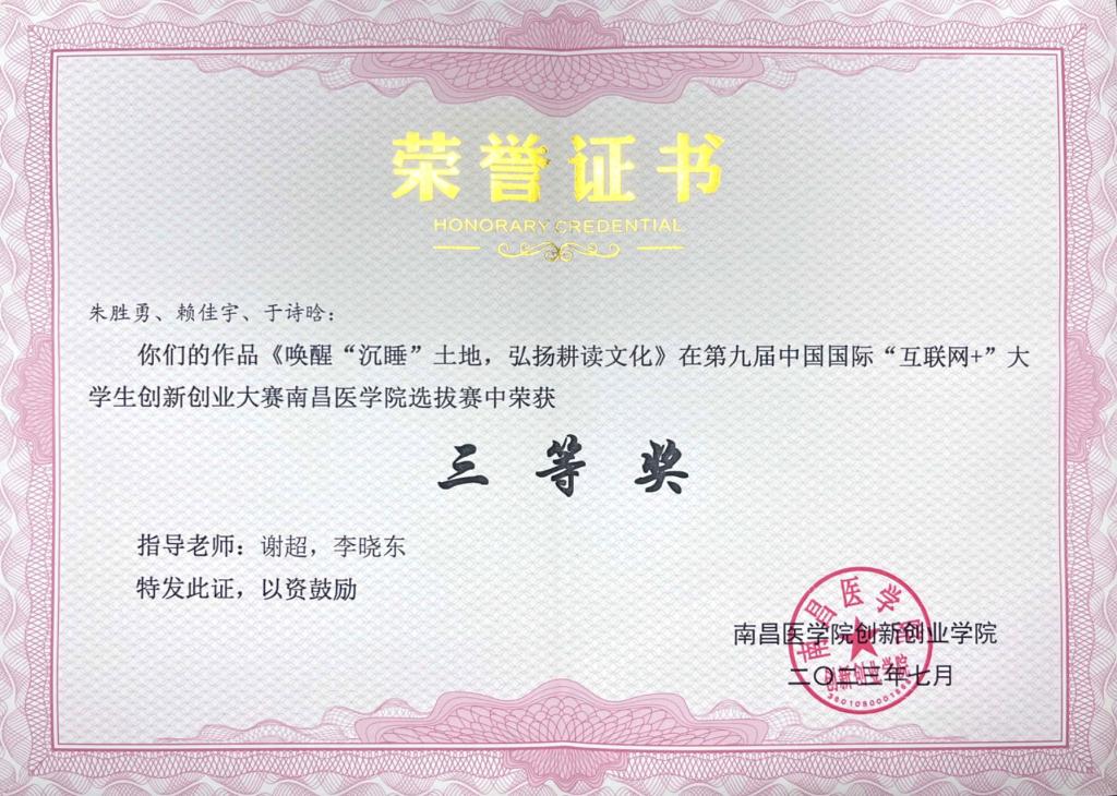 经过激烈的角逐,在谢超、李晓东老师的指导下公司由朱胜勇为负责人,赖佳宇、于诗晗为团队成员的“以读润心”团队,其作品《唤醒“沉睡”土地,弘扬耕读文化》荣获“互联网+”校级三等奖。未来公司将继续加强创新创业教育,为员工提供更多展示和锻炼的机会,培养更多的创新人才,助力员工成长与发展。(图\文:谢超)