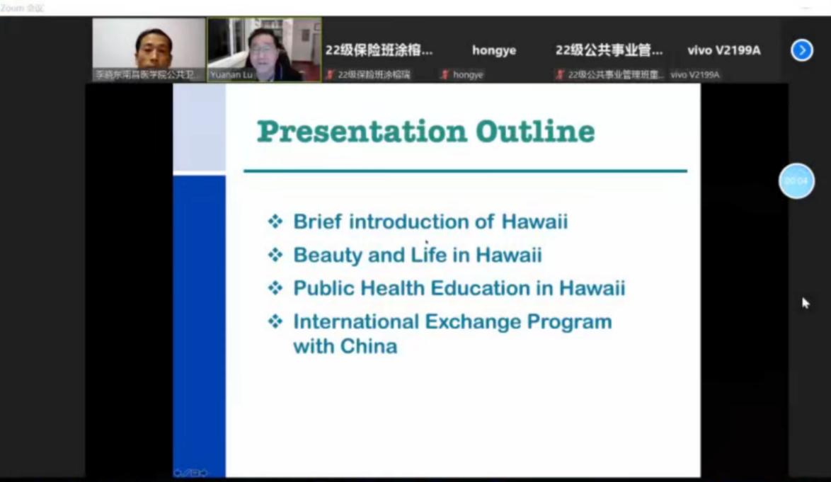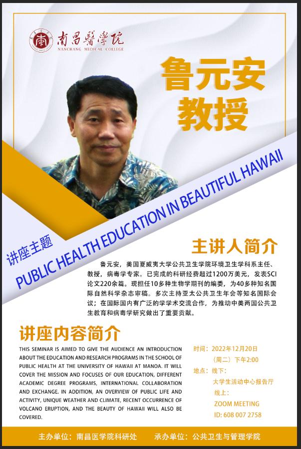 为加强国际交流与合作,提升公司师生的学术科研能力, 2022年12月20日下午,公共卫生与管理公司邀请夏威夷大学鲁元安教授,通过Zoom Meeting平台,举办主题为“PUBLIC HEALTH EDUCATION IN BEAUTIFUL HAWAII”学术讲座。公共卫生与管理公司副经理李晓东主持讲座,sunbet官方网站全体师生参加讲座。