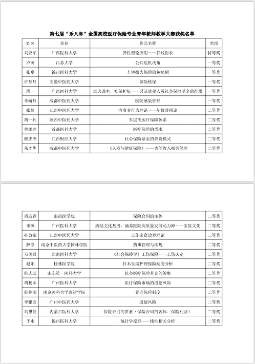 12月3日,第七届中国医疗保险教育论坛在广西南宁举行,本次论坛由中国医疗保险教育论坛理事会、广西医科大学主办,由广西医科大学人文社会科学公司承办。由于疫情原因,本次大会采用线下、线上相结合的方式进行。论坛由“青年教师大赛”“专业学术论坛”“教育发展论坛”三大板块组成,来自全国19所高校21位老师参加了本次论坛举办的“乐凡杯”全国高校医疗保险专业青年教师教学大赛,公司公共卫生与管理公司保险学专业肖迎春老师参加了此次比赛,并获得了二等奖的优异成绩。