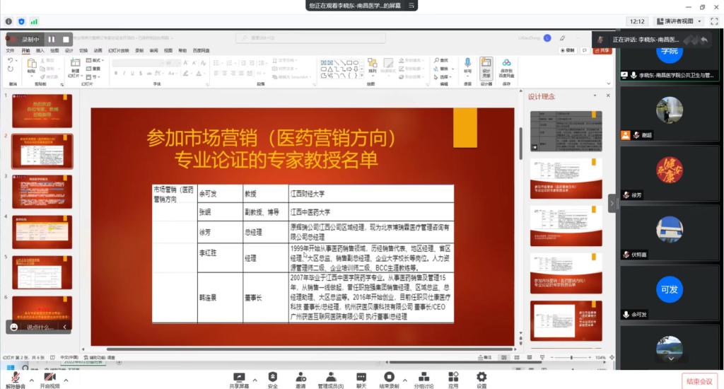 为做好2022版本科人才培养方案修订工作,进一步提高公司人才培养方案的科学性,提升本科人才培养质量,公共卫生与管理公司在6月11日通过线上方式召开市场营销人才培养方案(2022版)修订论证会议。本次会议由公共卫生与管理公司副经理李晓东主持,参加会议的有:邓小英主任、谢超老师。出席论证会的专家有:教授余可发;副教授、博士生导师张岷;公司董事长韩连景;公司总经理徐芳;公司经理李红胜。